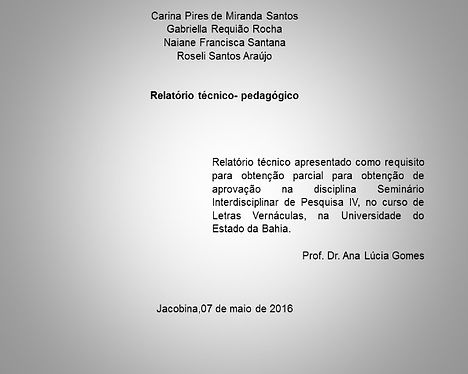 O referido relatório apresenta em sua base relatos da semana das apresentações de SIP Seminário interdisciplinar de pesquisa, e apresentações de TCC- Trabalho de conclusão de curso e estágios supervisionados, intitulado “Seminários... do SIP ao TCC: o percurso desafiador da pesquisa em Letras”. Realizado entre os dias 06 e 07 de junho de 2016 no Campus IV da Universidade do Estado da Bahia – UNEB –DCH - Departamento de Ciências Humanas, em Jacobina-BA.